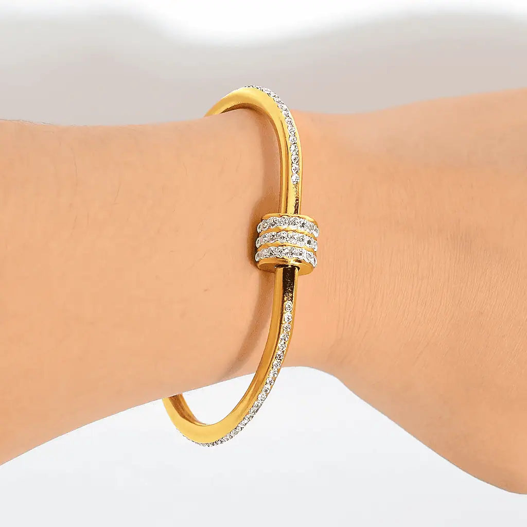 Radiate elegance with the Eterna Sparkle Bangle, a sleek and sophisticated piece designed for effortless glamour. Crafted with a gold-plated finish and adorned with dazzling cubic zirconia stones, this bracelet features a chic triple-ring centerpiece for a touch of modern luxury. Its secure clasp and comfortable fit make it perfect for daily wear, evening parties, weddings, and gifting. A must-have gold crystal bangle that pairs beautifully with any outfit.
