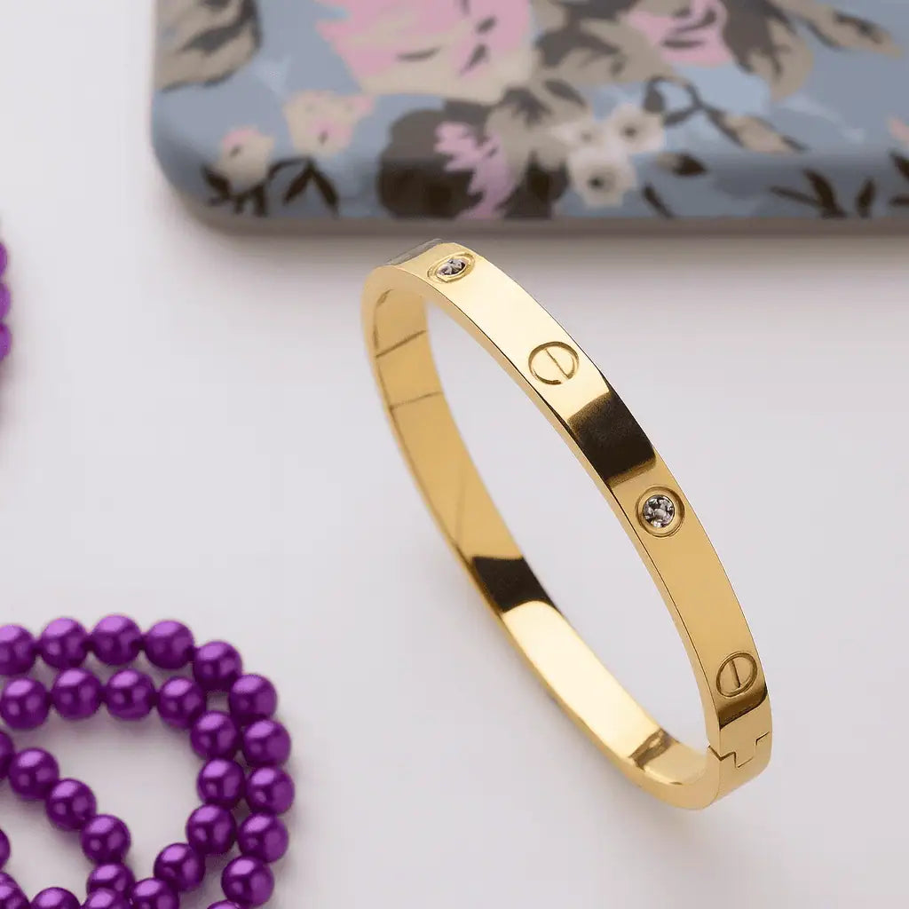 Upgrade your everyday style with this Golden Screw-Detail Crystal Bangle, a sleek and modern bracelet designed to add effortless luxury to your look. Featuring iconic screw-style engravings paired with sparkling crystals, this bangle delivers the perfect balance of sophistication and shine.