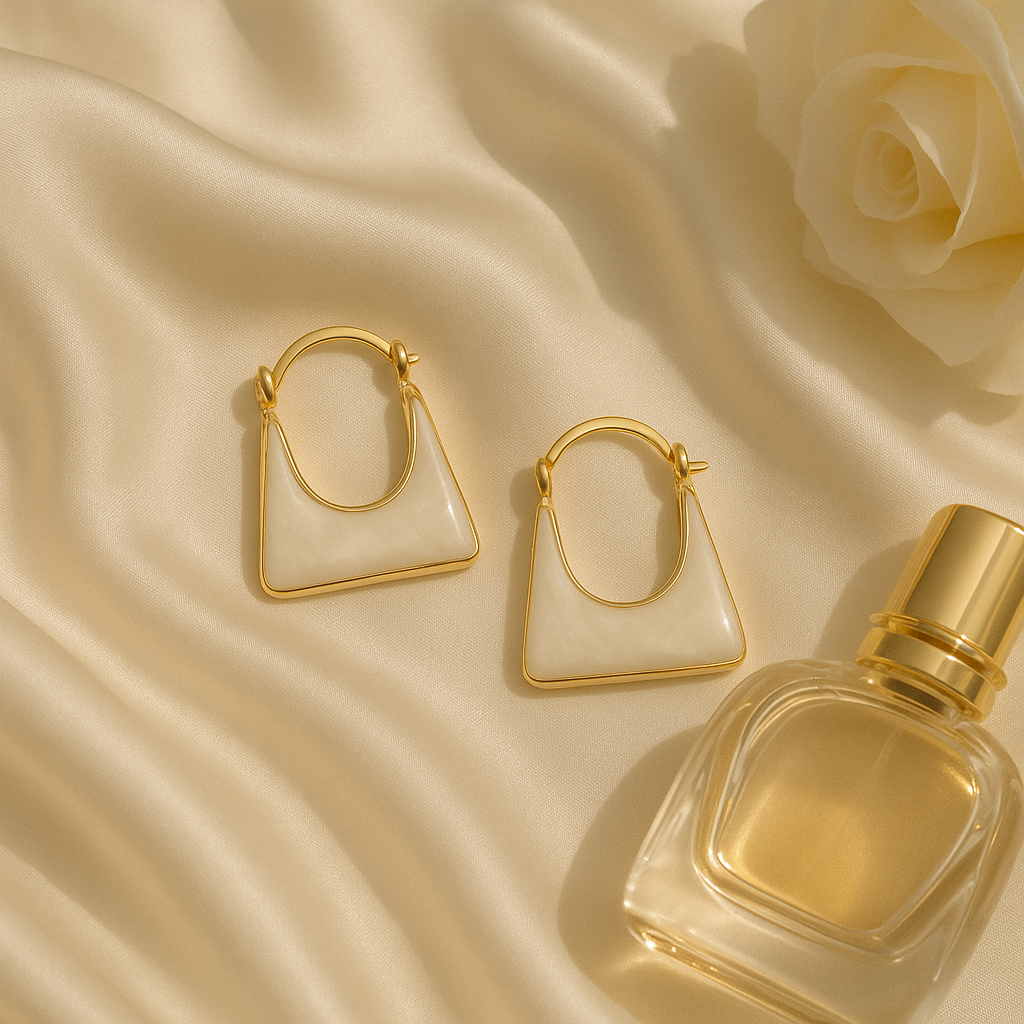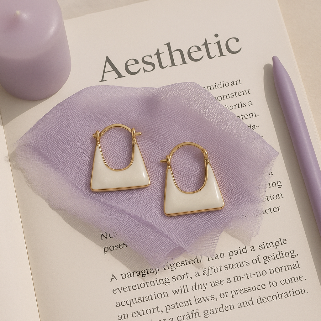 Step up your style with our Seoul Chic Bag Hoop Earrings, inspired by the trendy Korean minimal fashion aesthetic. Featuring a unique handbag-shaped design in glossy white enamel with a sleek gold-plated hoop frame, these earrings are perfect for adding a modern and playful touch to any outfit. Lightweight and comfortable, these Korean-style statement hoops are ideal for everyday wear, casual outings, or special occasions, making them a must-have fashion accessory for women who love unique jewellery.