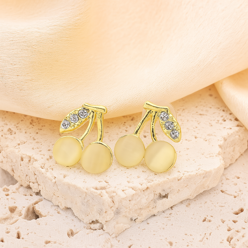 Embrace a touch of playful elegance with our Golden Cherry Earrings. Designed in a cute cherry shape, these dainty stud earrings feature soft yellow stones paired with sparkling crystal leaf details on a lustrous gold base. Perfect for adding a minimalist yet trendy vibe to your everyday or party look, these lightweight earrings for women offer all-day comfort. A must-have fashion accessory and a thoughtful gift choice, these yellow stone gold earrings will make any outfit glow with charm.