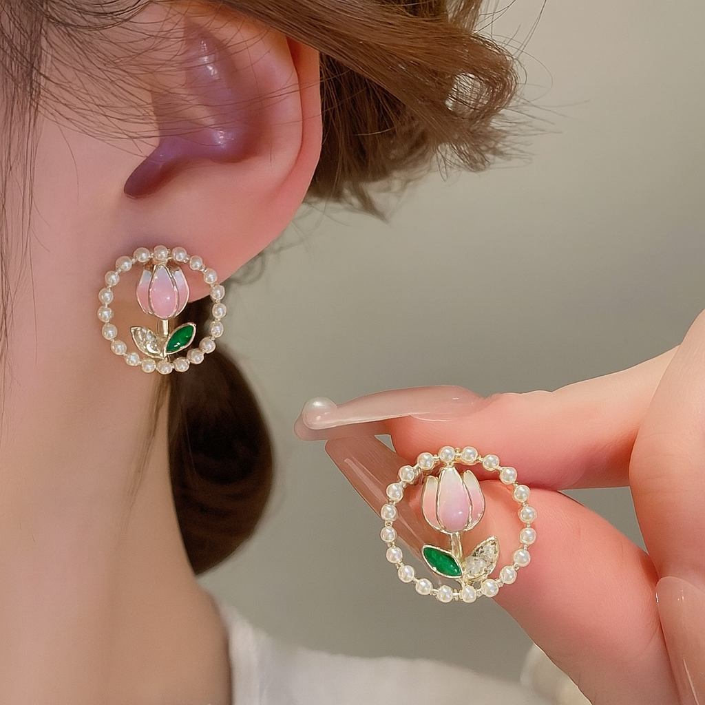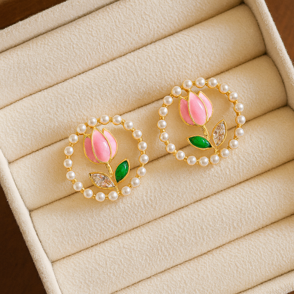 Delicate and romantic, our Pearl Lotus Bloom Stud Earrings feature a charming pink tulip framed by a circle of dainty pearls. Accented with green leaves and a sparkling crystal, they capture the essence of elegance and freshness. The golden finish adds a luxurious touch, making them perfect for both casual days and special occasions. Lightweight and comfortable, they bring a graceful floral charm to any outfit. A true statement of timeless femininity