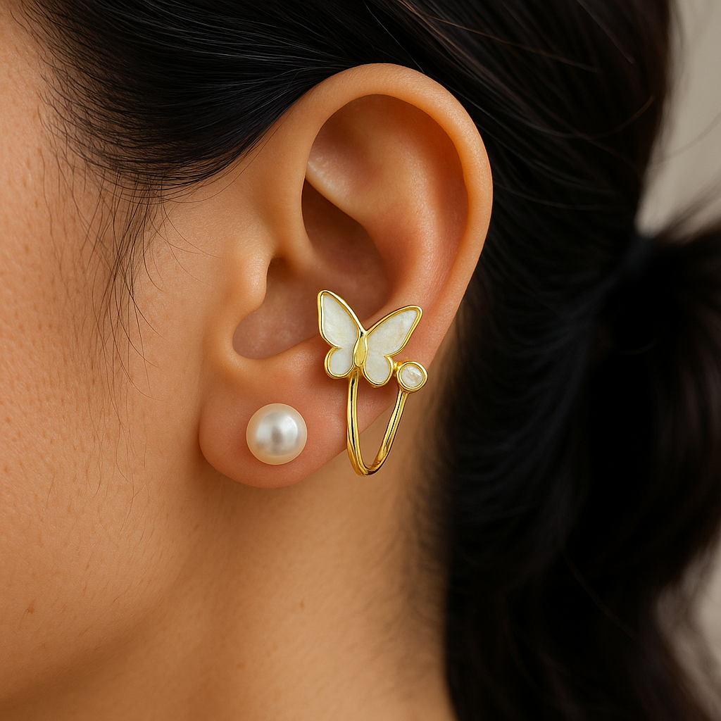 Add a dreamy twist to your ears with these ivory butterfly enamel studs featuring a delicate loop and faux pearl accent. Lightweight, elegant, and unique – perfect for casual chic or special moments that need a touch of grace.