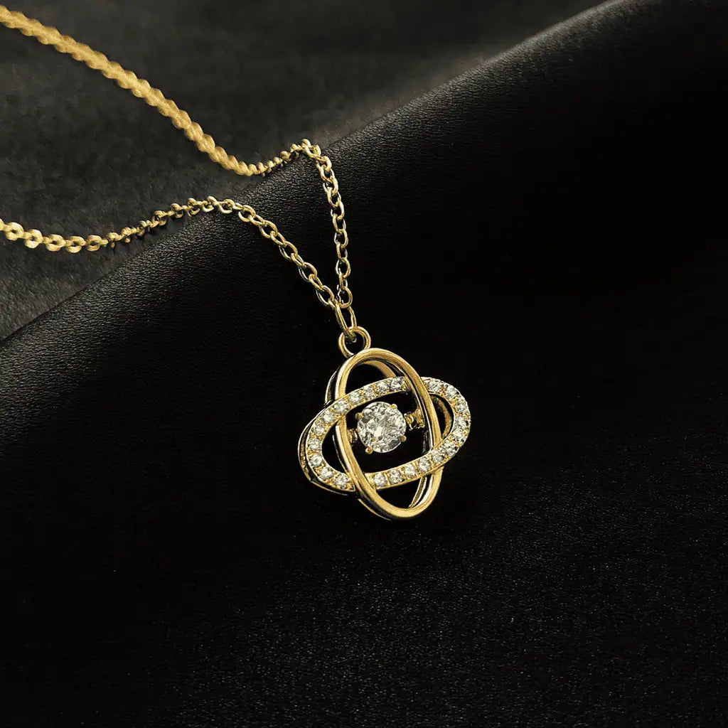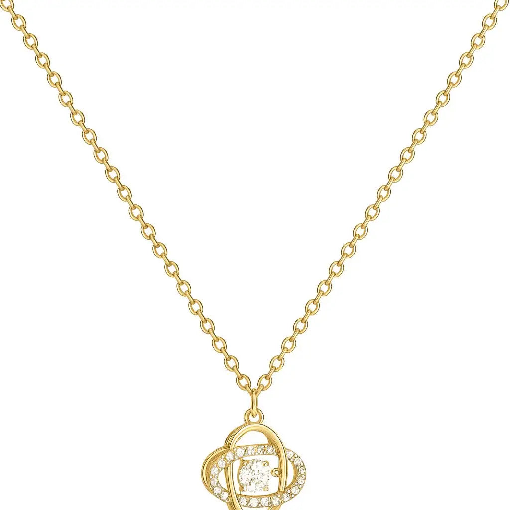 Elevate your style with the Celestial Orbit Crystal Pendant Necklace, a stunning gold-plated design inspired by the elegance of planetary orbits. The pendant features an intricate interlocking loop pattern, encrusted with shimmering cubic zirconia stones, and a brilliant central crystal that catches the light beautifully. Perfect for special occasions or daily wear, this gold crystal pendant necklace adds a touch of modern sophistication to any outfit. Ideal for women who love minimalist jewelry, sparkling gold necklaces, and designer pendant styles.