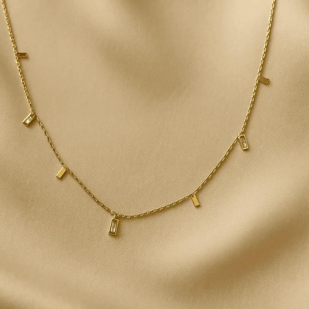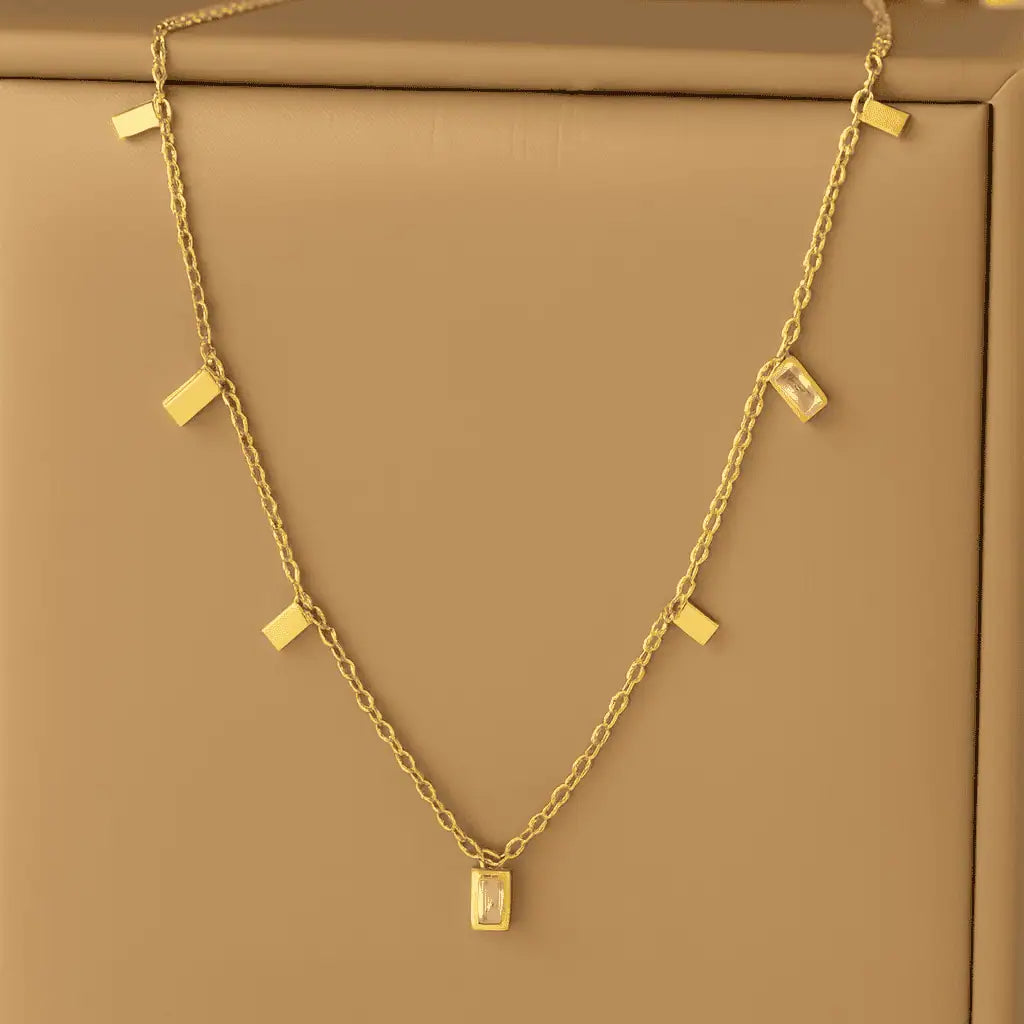 Elevate your elegance with the Golden Allure necklace — a delicate symphony of sophistication and style. This exquisite piece features a fine gold chain adorned with evenly spaced, minimalist square geometric charms that shimmer with every movement. Perfect for evening soirées or elevating everyday elegance, its refined design and timeless charm make it a must-have for the modern muse. Pair it with an off-shoulder dress or your favorite neckline to let its golden glow shine through.